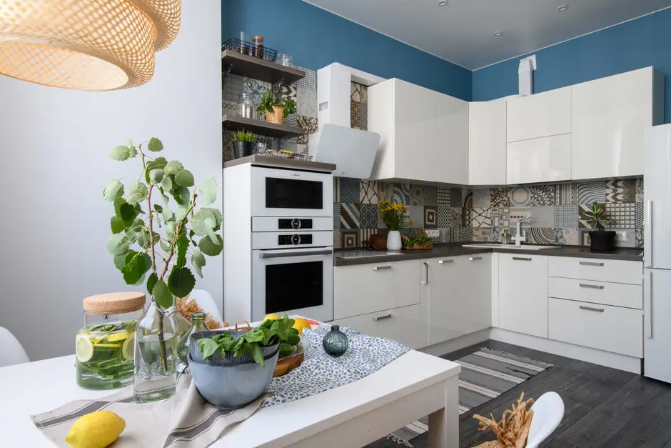Pentru mobilierul bucatariei, Anna a mers pe linia unui design simplu, cu front alb, lucios, iar spatiul dintre corpuri l-a amenajat cu placi ceramice decorative, aceleasi folosite si pentru pardoseala fostei logii, acum zona de luat masa. Alaturi de perimetrul cu canapea si televizor, acest spatiu face parte din zona de socializare dorita de tanara inca de la inceputul proiectului. Rezolvarea aceasta s-a dovedit a fi cea optima.