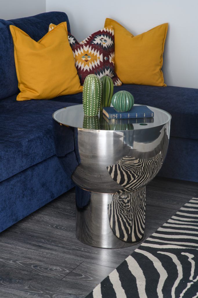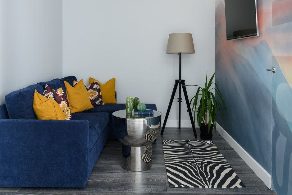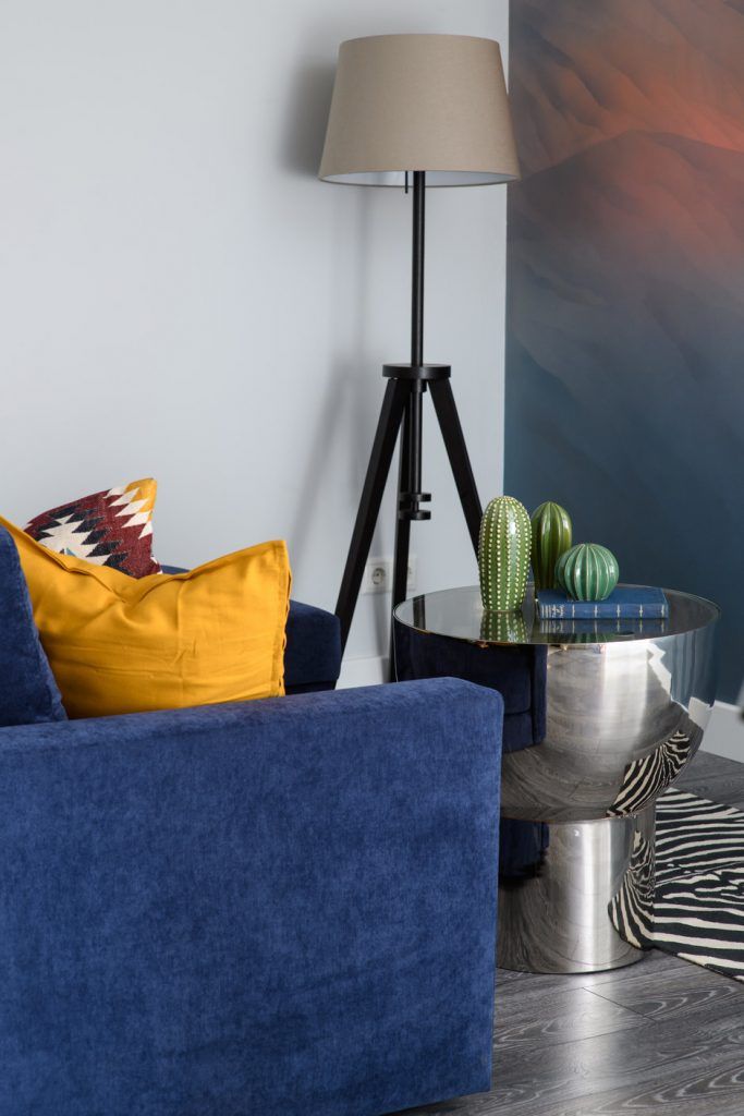 Cromatic, Anna a optat pentru o baza neutra, adaugand accente de culori, imprimeuri si texturi care sa creeze un plus de interes in ansamblul amenajarii. Unul din detaliile inedite este peretele pictat care incorporeaza si o usa ascunsa (prin ea se face accesul spre dormitor). De aceea, nu este intamplatoare alegerea albastrului din zona bucatariei, tinand cont de pictura ce infatiseaza un peisaj montan. Se creeaza astfel o legatura subtila intre cele doua functiuni.