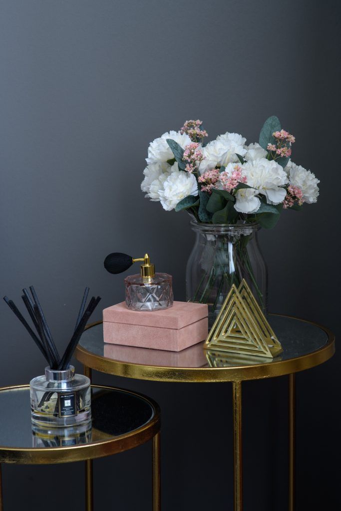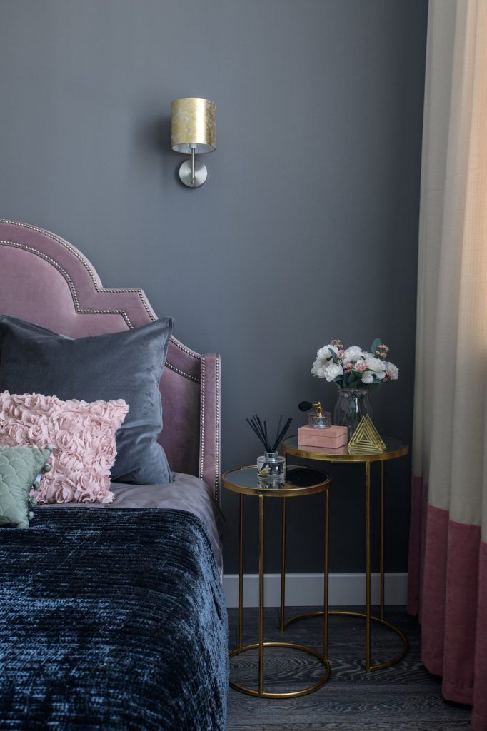 Desi foarte mic, dormitorul impresioneaza prin tonurile inchise, care imprima un plus de profunzime decorului. Tapetul cu imprimeu floral, tablia capitonata, masutele pe post de noptiera si lampile pentru iluminat traduc un spatiu usor excentric, de inspiratie art deco.