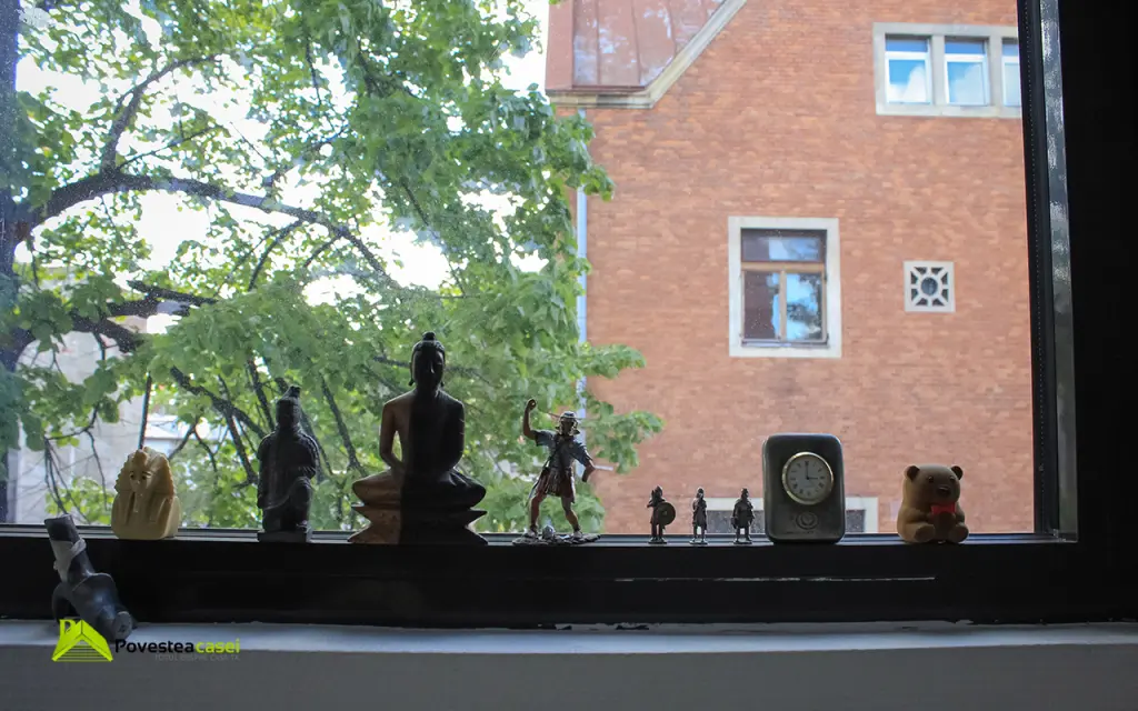 Pe marginea pervazului, la loc de cinste, sunt insiruite totemuri adunate din calatorii, intr-o ordine numai de posesor stiuta.
