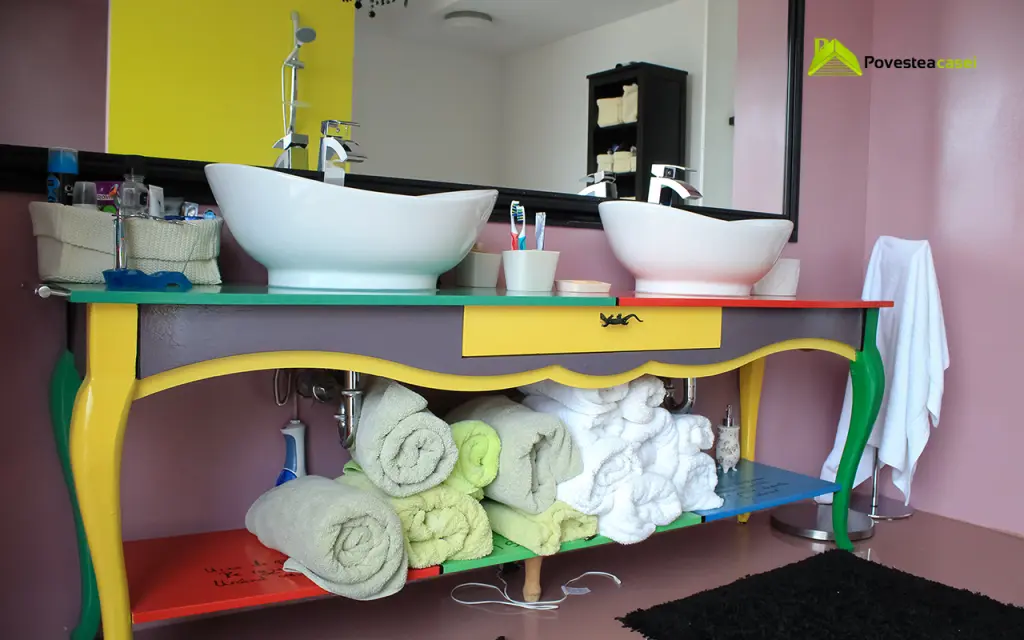Etajerele din baie au fost pictate manual si imbogatite cu citate celebre despre filozofia iubirii
