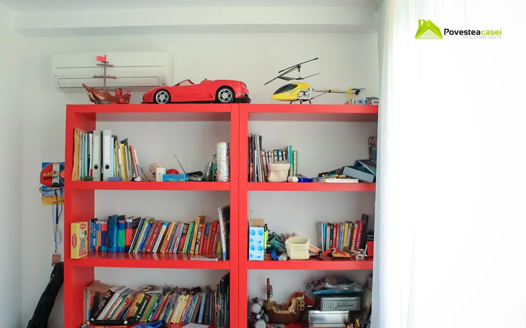 Dormitorul baietelului ne avertizeaza inca de la intrare ca avem de a face cu un pasionat de bolizi de Formula 1, de scrima si de lectura.