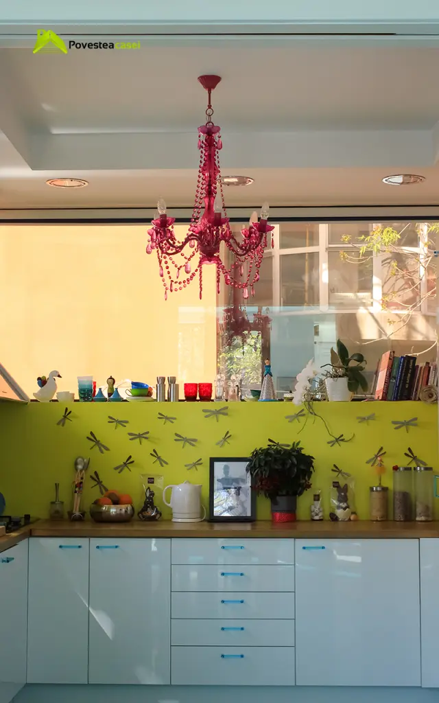 Bucataria, separata prin doua usi glisante imprimate cu fotografiile stilizate ale copiilor, a primit si ea infuzia de culoare – candelabrul fucsia, peretele verde crud intesat de libelule metalice, ustensilele de bucatarie fantezie marca Piu-Piu.