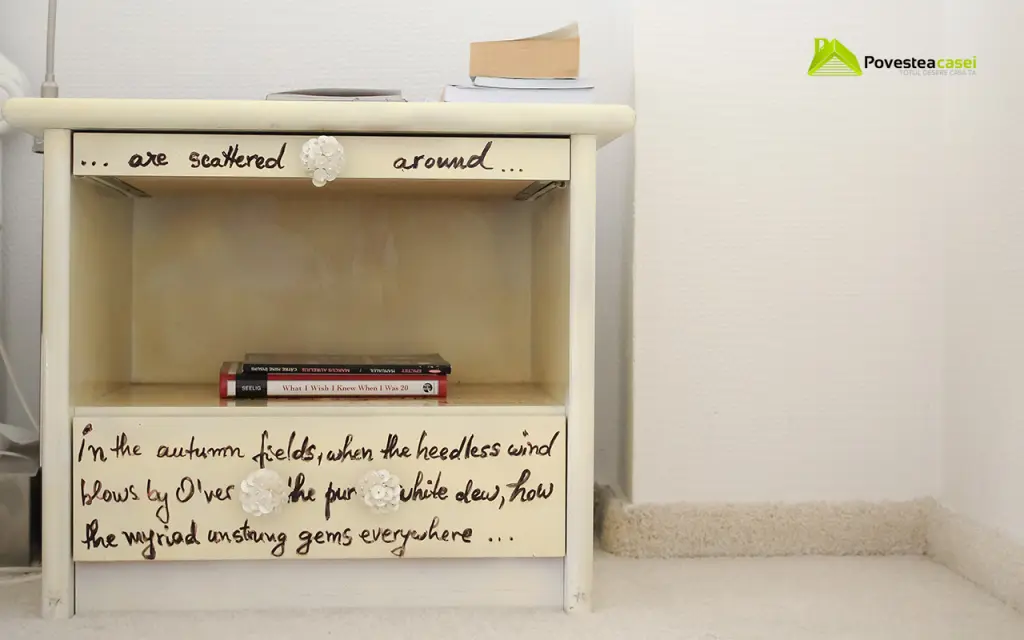 In dormitorul parintilor, paleta cromatica intra pe terenul neutru al tonurilor de alb, unde remarcam rezultatul pasiunii dintre reconditionarea pieselor vechi de mobilier si memoria unui cititor infocat – partea feminina este autoarea noptierelor personalizate cu citate celebre.