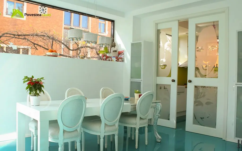 Livingul, amenajat intr-un open space ce isi deschide ochii ferestrelor spre gradina, abunda in culoare – podeaua acvamarin te invita sa uiti de tot ce te-a urmarit peste zi si sa te abandonezi relaxarii, in timp ce jocul texturilor din obiectele de decor iti vor limpezi privirea.