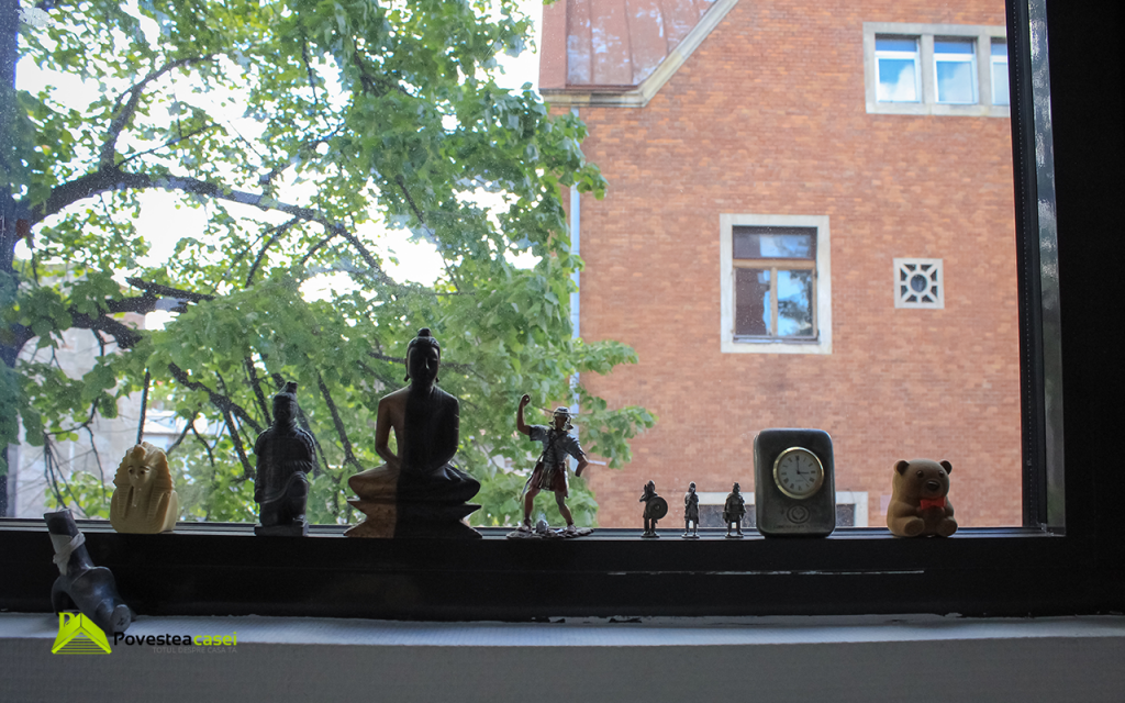 Pe marginea pervazului, la loc de cinste, sunt insiruite totemuri adunate din calatorii, intr-o ordine numai de posesor stiuta.