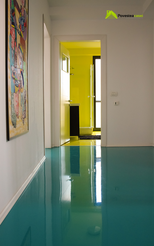 Acvamarin si tonalitati de verde lime o paleta fresh si materiale care complimenteaza un spatiu luminos
