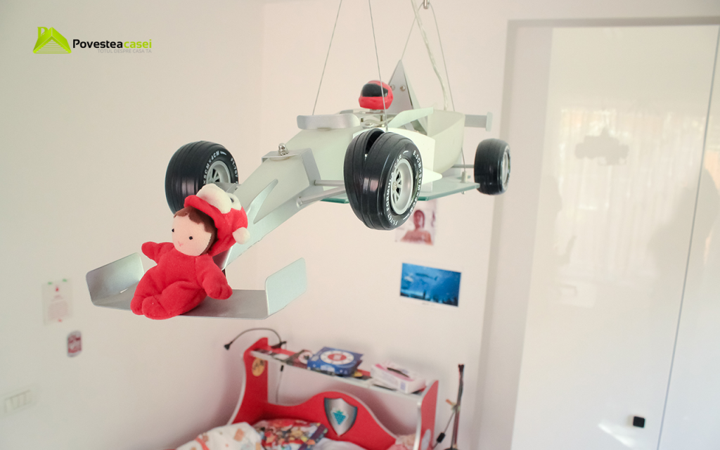 Dormitorul baietelului ne avertizeaza inca de la intrare ca avem de a face cu un pasionat de bolizi de Formula 1, de scrima si de lectura.