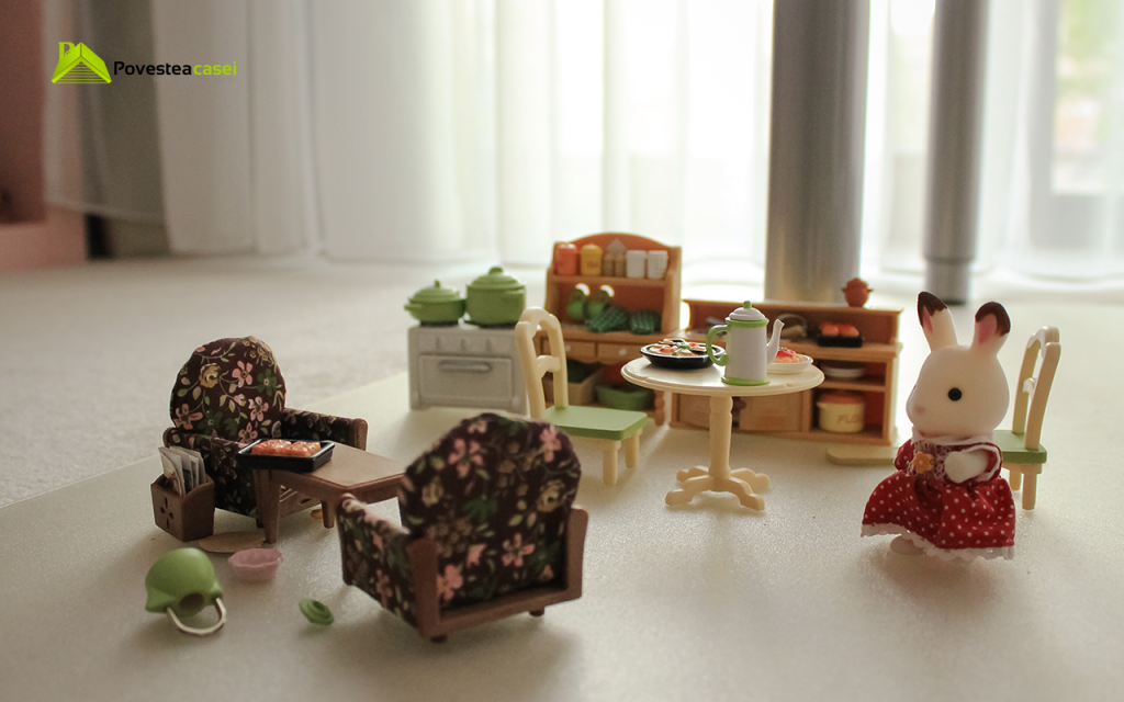 Un viitor pasionat de design interior casa papusilor are mobilier tapitat si etajere de lemn, in stil rustic