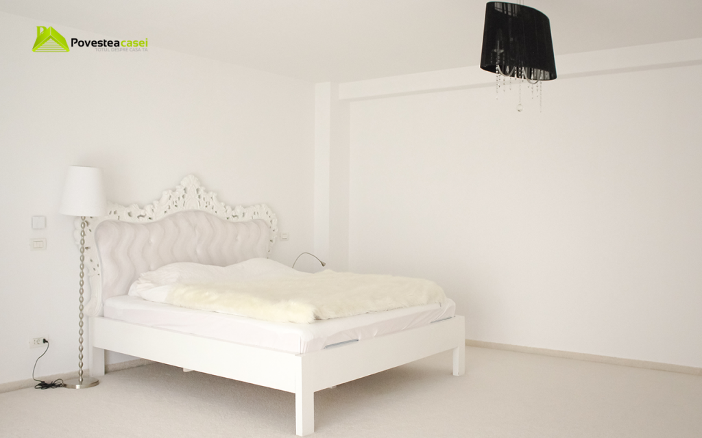 In dormitorul parintilor, paleta cromatica intra pe terenul neutru al tonurilor de alb, unde remarcam rezultatul pasiunii dintre reconditionarea pieselor vechi de mobilier si memoria unui cititor infocat – partea feminina este autoarea noptierelor personalizate cu citate celebre.