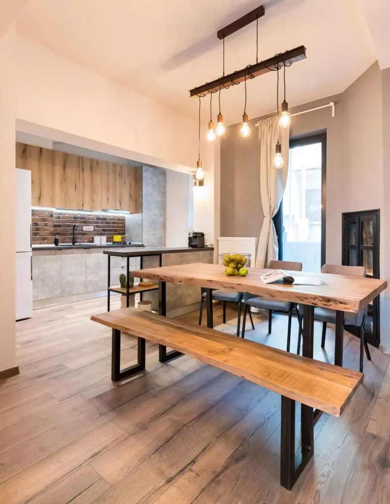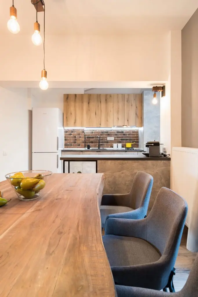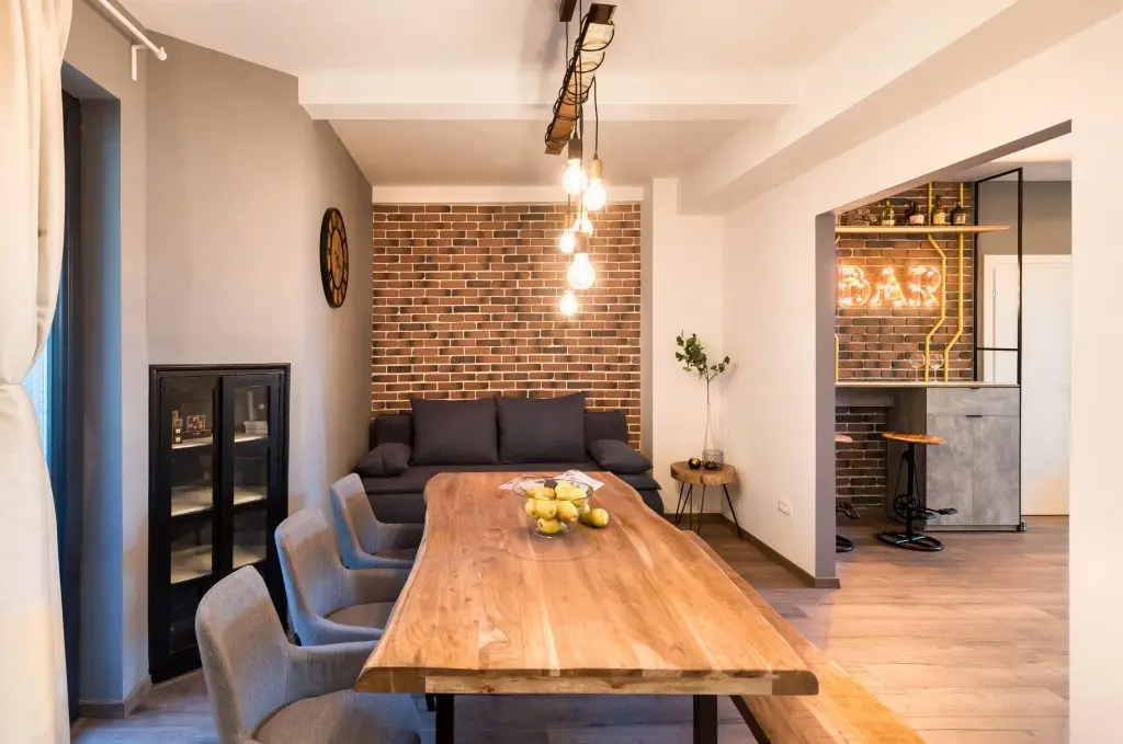Pentru a contura stilul dorit au fost atent alese finisajele si detaliile pieselor de mobilier. Regasim astfel placare cu caramida aparenta, lemn cu aspect brut, lemn reciclat si pal cu aspect de beton folosit la realizarea mobilierului la comanda (Triaxis Mob).