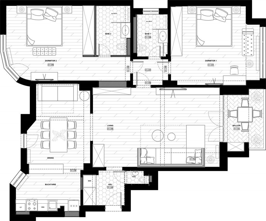 Clientii si-au dorit ca stilul sa fie inspirat din cel industrial, cu aspect brut, cu o personalitate puternica, evitand senzatia ca este prea gol sau rece. Il putem defini astfel ca un stil modern, cu influente industriale; accentele decorative din metal contrasteaza armonios cu tesaturile moi ale draperiilor, canapelelor si scaunelor din dining.