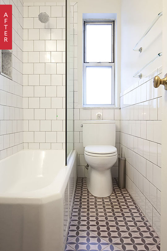 Flisele au fost inlocuite cu unele albe, simple, iar gresia a fost schimbata cu una in model floral, care sa aduca mai mult interes incaperii. In locul unei perdele de dus care ar fi facut spatiul mult prea mic si claustrofob, s-a optat pentru instalarea unui panou din sticla transparenta care separa spatiul cazii de toaleta fara a incarca spatiul.