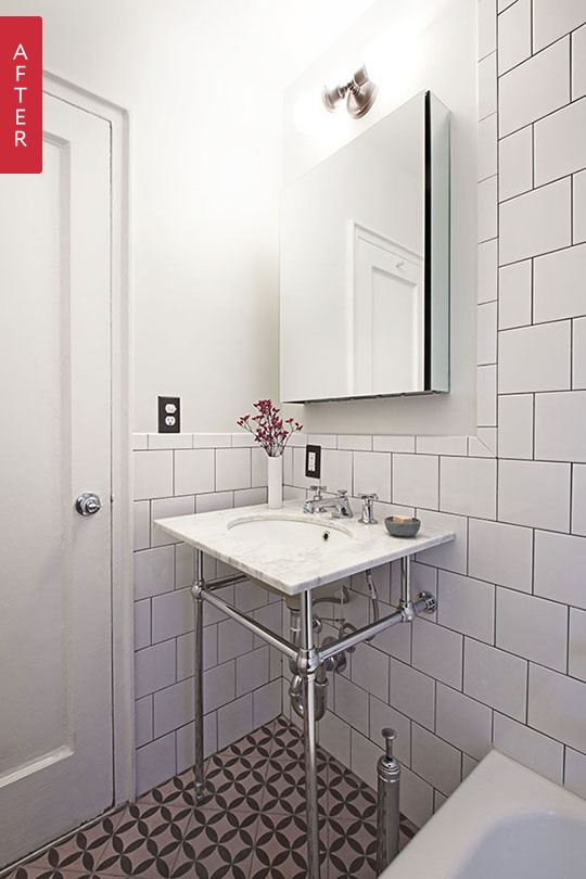 Vechiul lavoar a fost inlocuit cu marmura, picioarele subtiri, metalice, de inox, elibereaza vizual spatiul, creand acelasi sentiment de o zona mai larga, aerisita. Dulapul de deasupra chiuvetei asigura spatiul necesar pentru depozitare, oglinda montata pe usa lui fiind o solutie practica pentru a avea pereti liberi, neincarcati.