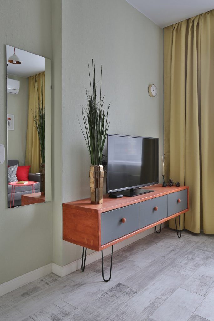 Pentru finisaje si decoratiuni au fost propuse materiale practice care sa se incadreze in bugetul stabilit initial. Regasim o pardoseala din parchet laminat, peretii din living au fost finisati cu tapet lavabil; backsplashul de la bucatarie a fost placat cu oglinda bizotata care mareste vizual spatiul.