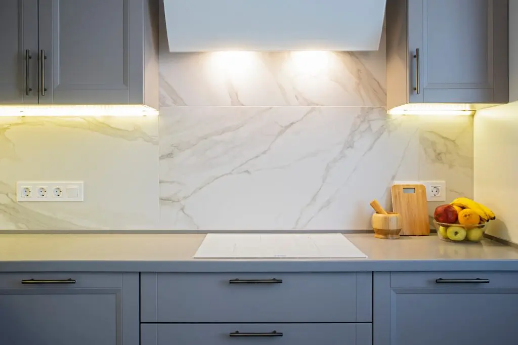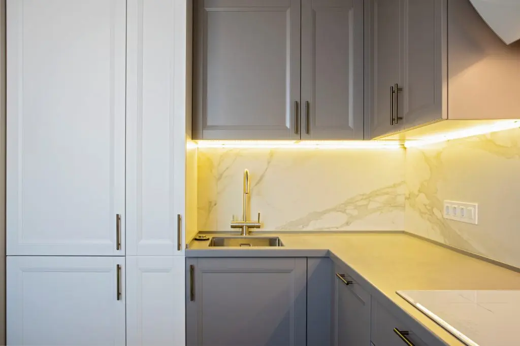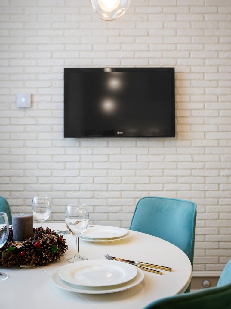 Bucataria, cu mobilierul din mdf gri si alb, a fost pusa in valoare de nuantele de turquoise folosite la tapiteria scaunelor si a draperiei. Backsplashul din marmura Calacatta contribuie la atmosfera eleganta a spatiului, in timp ce iluminarea cu benzi L ED a intradosului mobilierului suspendat asigura un iluminat util, de accent, si evidentiaza latura moderna a amenajarii.