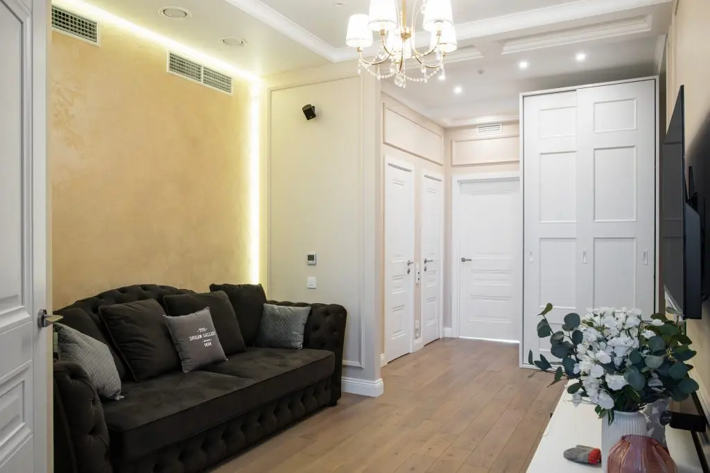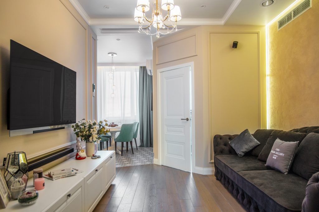 Rezultatul interventiilor de compartimentare este un apartament cu multe zonificari practice si aerisit in acelasi timp, pastrandu-si eleganta in pofida spatiilor de mici dimensiuni. Din holul de intrare se ajunge in zona de living si apoi in bucataria spatioasa cu diningul integrat.