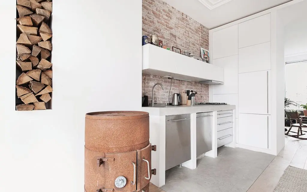 O parte din farmecul acestui apartament o constituie elementele de inspiratie industriala precum accesoriile din bucatarie:chiuveta, blatul din beton, dulapuri din inox, dar mai ales sobele, vedetele amenajari prin caracterul lor vintage.