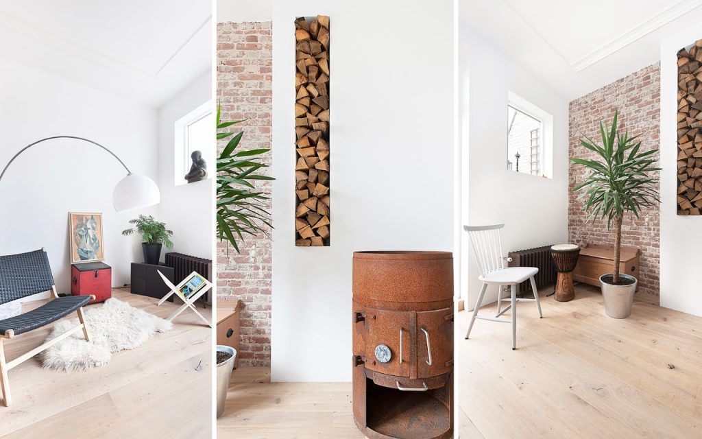 In dormitor, paletii din lemn au fost folositi pentru a contura ideea unui pat mai altfel. Baia vine cu o abordare inedita: chiuveta rotunda, moderna este sustinuta de un vechi corp de mobila recuperat dinainte de renovare, un mix superb intre modern si vintage. Ne-au atras atentia si lemnele ca piese de decor folosite pentru functionarea celor 2sobe.