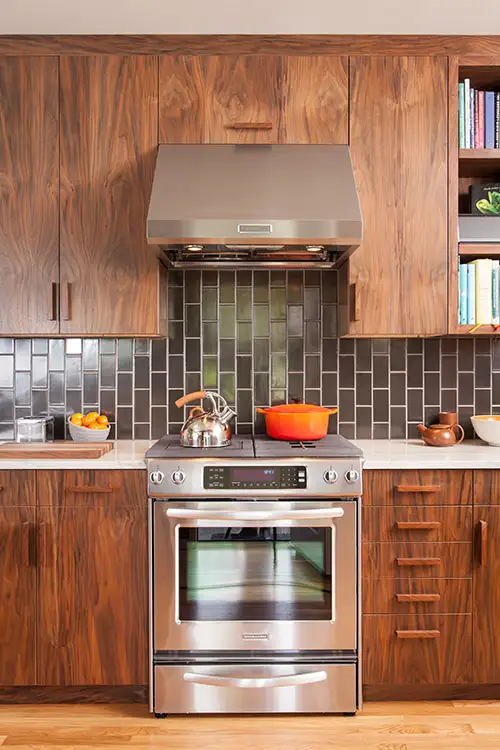 Desi culorile alese sunt in tonuri inchise, atmosfera per ansamblu este una placuta, ideala pentru gatit. Culorile neutre, deschise ale peretilor, usii si ferestrelor incadreaza perfect flisele negre si mobilierul din lemn de nuc. Pentru un accent contemporan, au fost alese electrocasnice lucioase, cu aspect din otel.