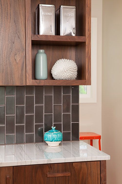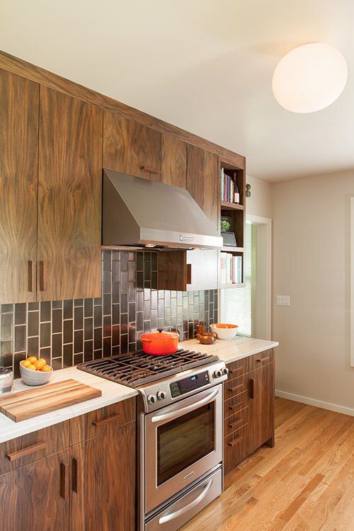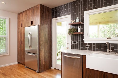 Desi culorile alese sunt in tonuri inchise, atmosfera per ansamblu este una placuta, ideala pentru gatit. Culorile neutre, deschise ale peretilor, usii si ferestrelor incadreaza perfect flisele negre si mobilierul din lemn de nuc. Pentru un accent contemporan, au fost alese electrocasnice lucioase, cu aspect din otel.