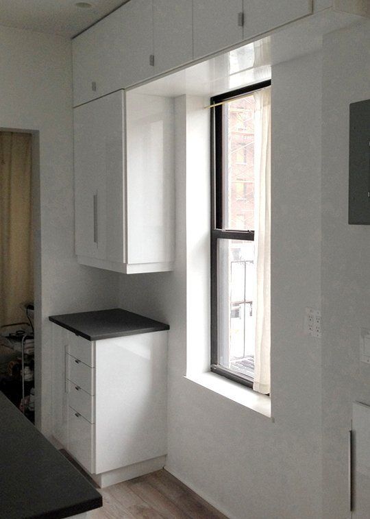 Au fost introduse spoturi sub dulapuri pentru a lumina eficient zona blatului de lucru. Noile dulapuri albe cu suprafata lucioasa, montate pana in tavan ofera suficient loc pentru depozitare; se foloseste astfel eficient spatiul pe verticala oferit. De remarcat faptul ca peretii au fost doar vopsiti in alb fara a mai incarca cu flise.