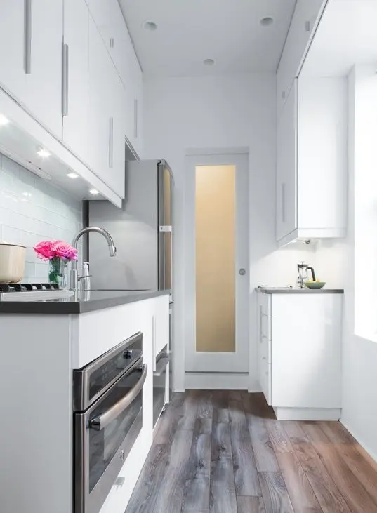 Amenajarea acestei bucatarii ne demonstreaza din plin ca indiferent de dimensiunea spatiului, un spatiu poate fi bine organizat si eficientizat chiar si cu un strop de stil.