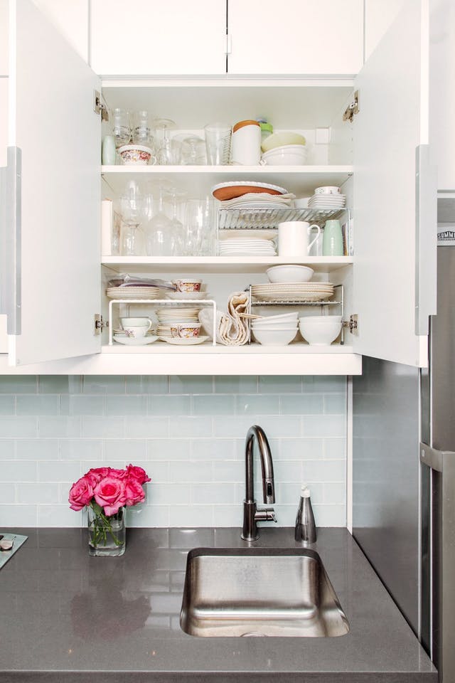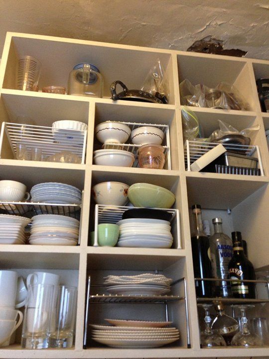 Bucataria inainte de renovare rafturile deschise aglomerate cu diverse obiecte