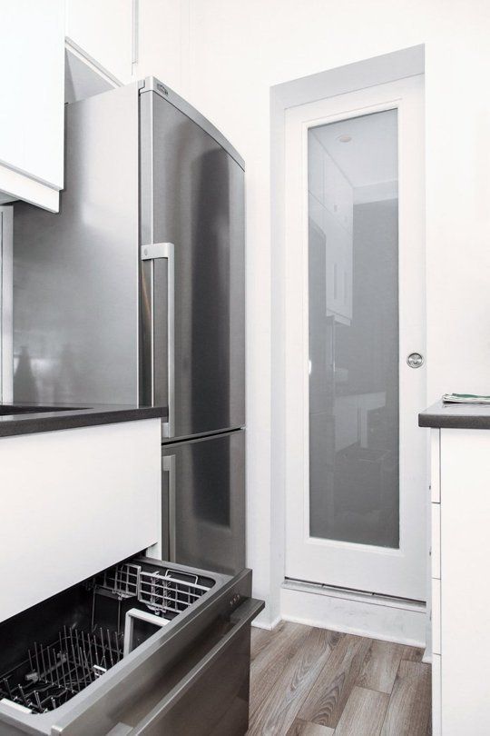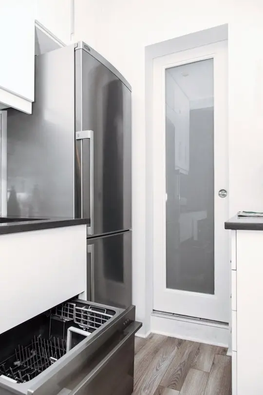 Desi extrem de ingusta, noua bucatarie cuprinde si electrocasnicele necesare: frigider, plita, cuptor si chiar o masina de spalat vase.