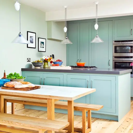 Verdele pastelat alaturi de rafturile deschise si o masa din lemn vor crea un look rustic. Adauga o podea din lemn de pin si vei pune in evidenta un stil natural.