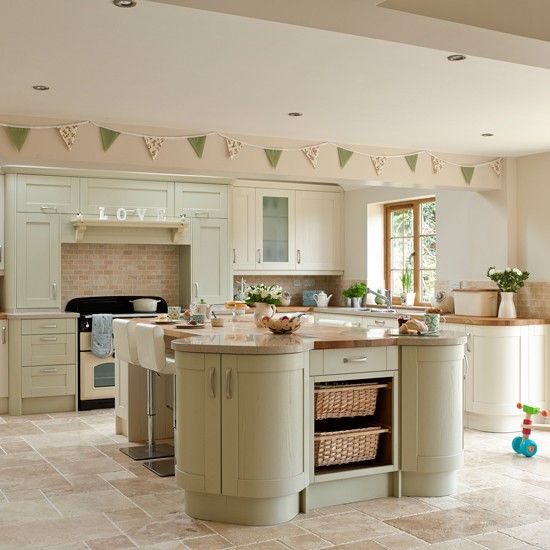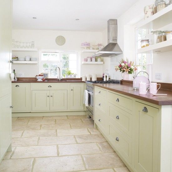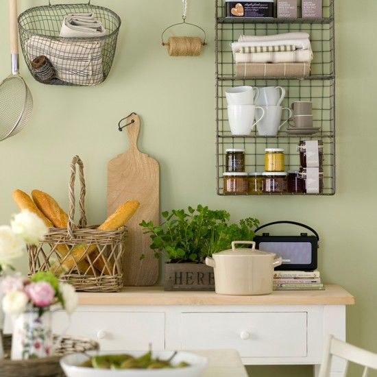 Verdele pastelat alaturi de rafturile deschise si o masa din lemn vor crea un look rustic. Adauga o podea din lemn de pin si vei pune in evidenta un stil natural.