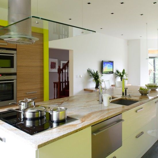 Daca esti adeptul unei bucatarii moderne, combina verdele vibrant al dulapurilor cu lemn pal si accesorii lucioase si vei obtine un design amuzant, vesel.