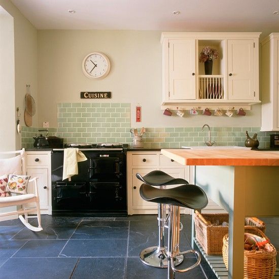 Pentru a inviora putin atmosfera din bucatarie foloseste cateva flise dintr-un verde pal deasupra chiuvetei sau dedesubtul dulapurilor. Efectul va fi garantat!