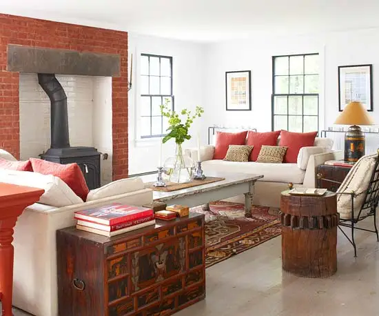 Aspect vintage prin rosul caramizilor si pernelor decorative