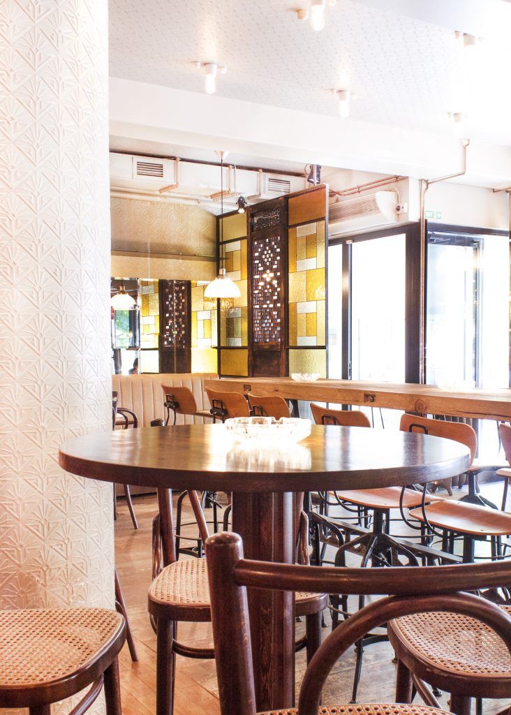 Deschide GaleriaAmenajarea localului a durat patru luni, iar materialele folosite difera de la cupru, marmura, caramida, tapet embosat, oglinzi antichizate, candelabru de cristale, mozaic ceramic si paravane antice chinezesti pana la lemn reciclat precum cel de pe tavan care provine dintr-un hambar vechi de pa langa Sibiu. Cea mai mare parte a mobilerului a fost confectionat la o fabrica de langa Cluj, iar o alta parte a fost cumparat de la anticariat sau comandat din strainatate.