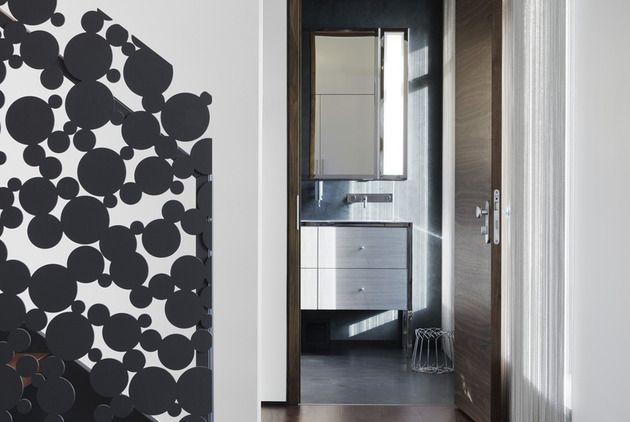 Pe langa aceasta scara dantelata din fier, vopsita in negru, podeaua a fost realizata din lemn masiv de nuc pentru a crea o ambianta foarte bine integrata cu designul contemporan pe care si-a dorit sa mearga proprietarul canadian.