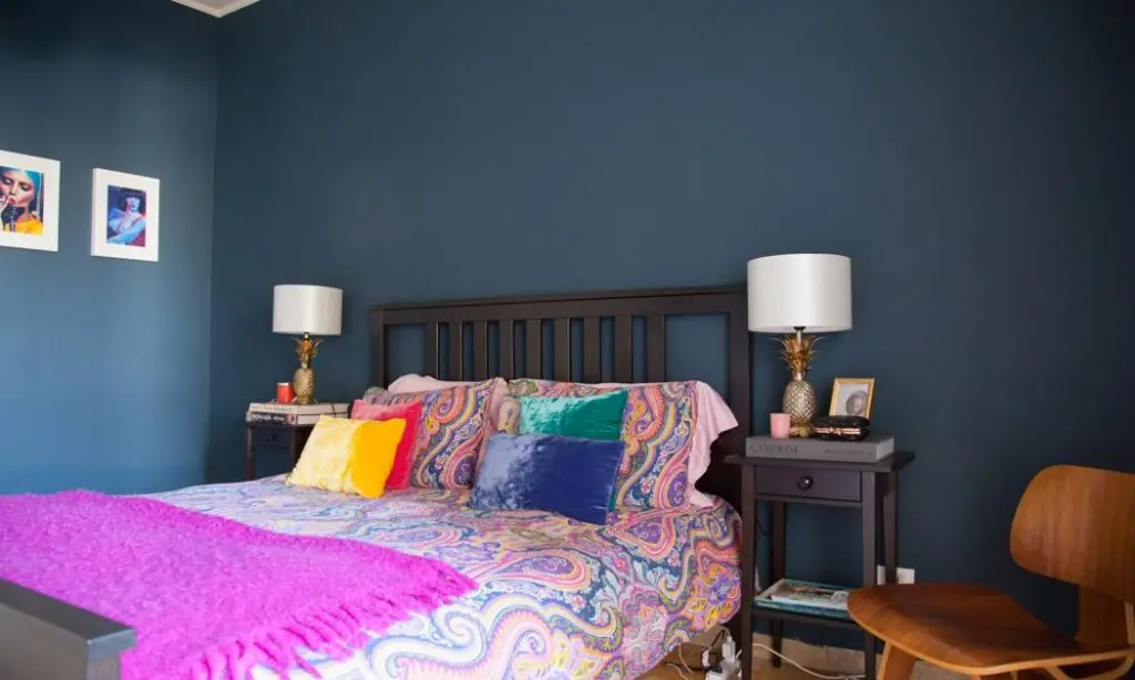 Dormitorul principal are o paleta cromatica distincta de restul apartamentului, tonurile de culoare sunt prezente atat in peretii vopsiti in albastru, cat si in obiectele decorative mici, dar de efect. Piesele de mobilier foarte moderne, simple, creeaza refugiul perfect pentru un artist.