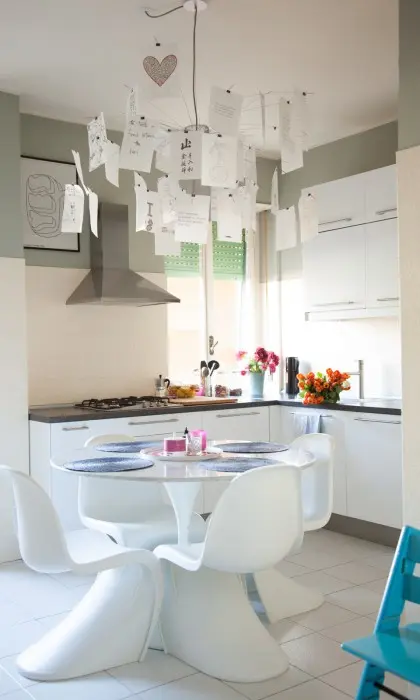 Bucataria nu imprima extravaganta, designul simplu avand la baza nuante neutre, calde, predominant alb. Modernismul este prezent in intreaga incapere, de la scaunele, in forma iregulara, pana la corpul principal de iluminat.