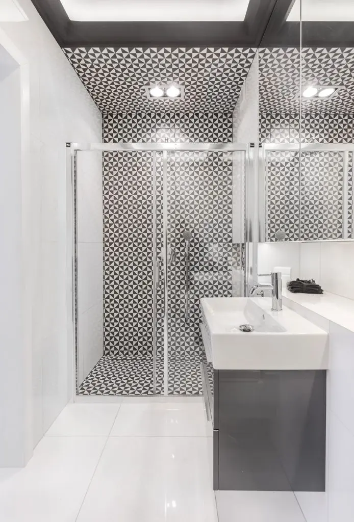 Gresia si faianta din zona cabinei de dus formeaza impreuna cu scafele din tavan o usoara iluzie optica si paradoxal vin in continuarea albului, a oglinzii si a luminozitatii, pentru a mari vizual incaperea si a o abstractiza.