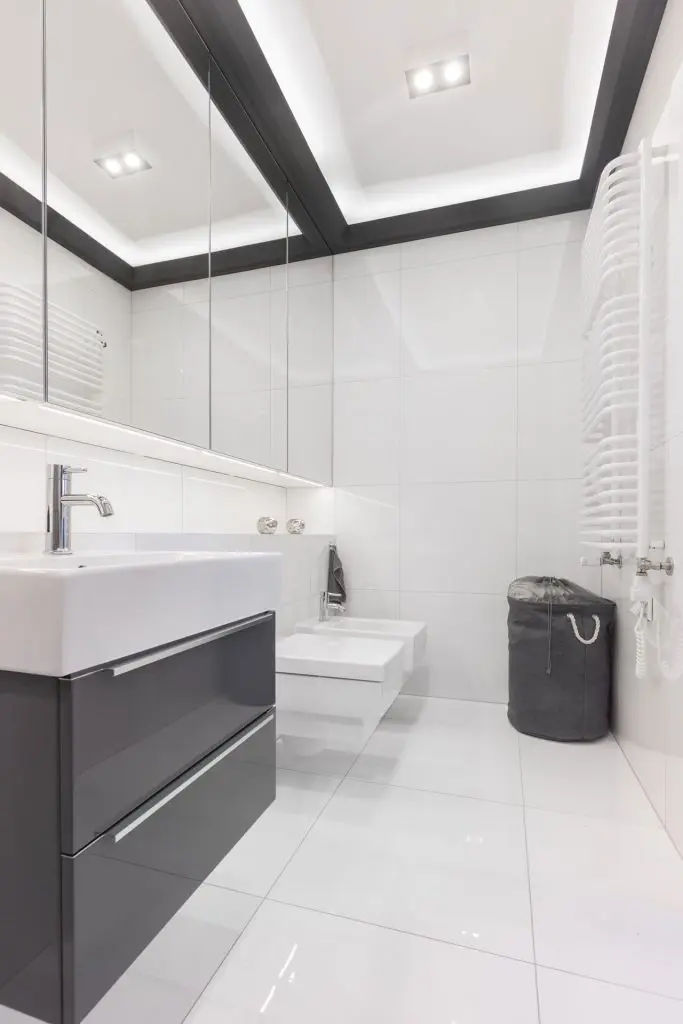 Baia se focuseaza pe un design monocromatic si respecta linia moderna atat prin introducerea unui mobilier simplist, cat si prin scoaterea in evidenta a unei oglinzi de dimensiuni impresionante ce incadreaza intreg peretele.