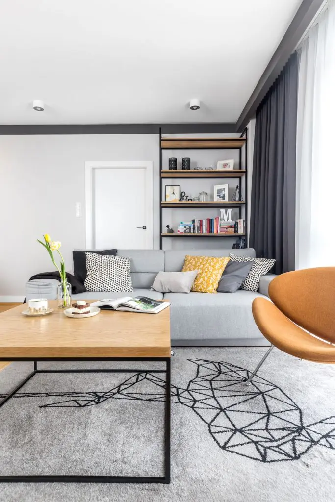 Bucataria si living-ul acestei amenajari formeaza impreuna un open space vizibil marit, loc dedicat relaxarii, pregatirii si servirii mesei, dar si socializarii. Din punct de vedere cromatic, intreg spatiul avut la dispozitie este dominat de non-culori prezente atat mural, cat si in mobilier si accesorii textile, singura pata de culoare scoasa in evidenta subtil, fiind orange-ul accesoriilor.