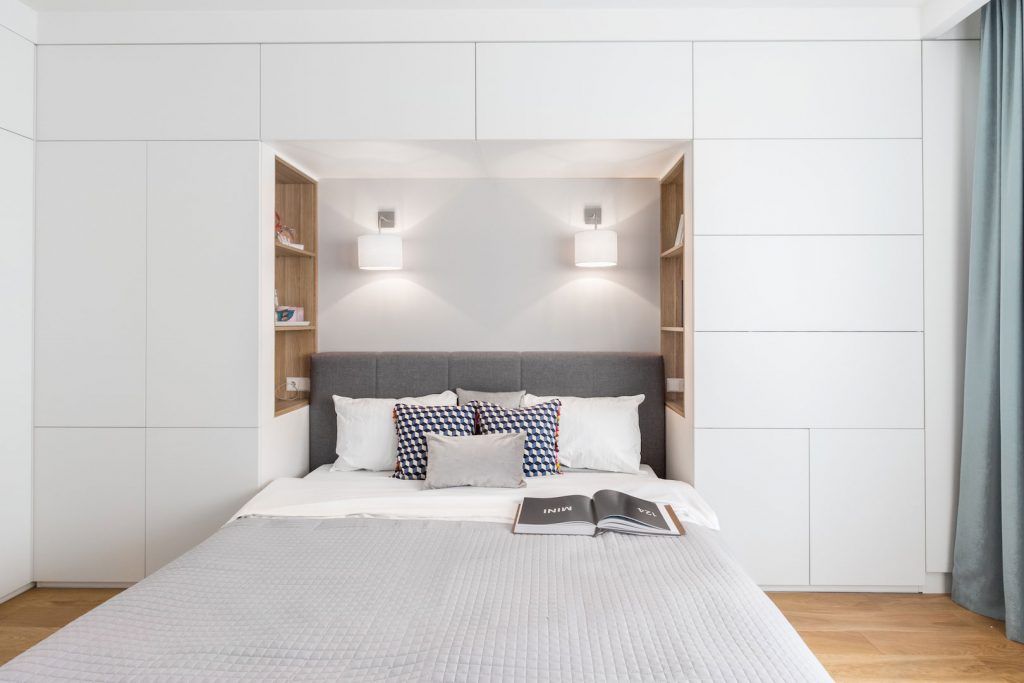 Cea mai functionala camera este dormitorul matrimonial. Prin intermediul mobilerului care incadreaza patul, spatiul atinge functionalitatea intr-un stil ultra modern, piesele de mobilier putand fi metamorfozate intr-un birou dedicat desfasurarii activitatilor specifice. Nuantele predominante sunt cele de alb, gri si lemn natural, toate caracteristice stilului minimalist.