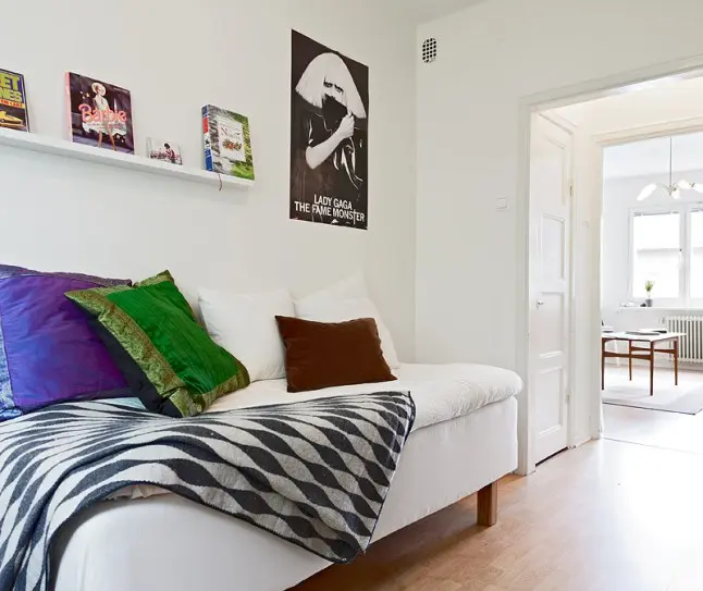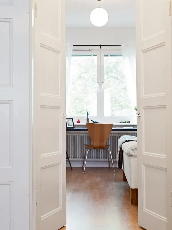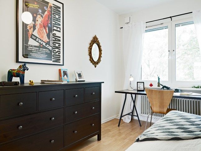 Spatiul restrans al dormitorului ne demonstreaza cum poti fi creativ si ordonat intr-o camera destinata in principal odihnei. Biroul de la fereastra nu incarca incaperea, fiind o alegere inspirata si practica. Alegerea acestui model de comoda ajuta spatiul, asigurand in acelasi timp si loc pentru depozitarea hainelor.