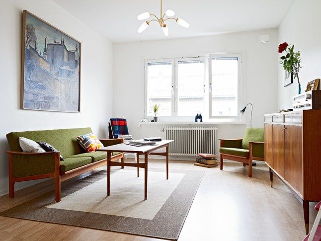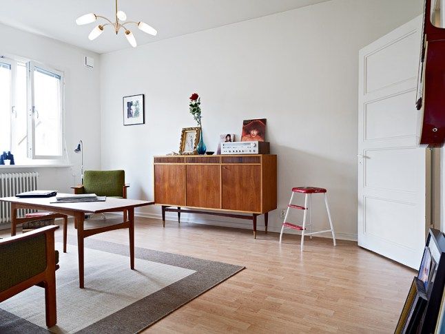 Apartamentul de astazi ne poarta intr-o calatorie intr-un spatiu retro, cu mobilier tipic anilor 1950, pe un fundal de stil scandinav. Resimti minimalismul pe care pun mare pret nordicii, dar spatiului nu-i lipsesc accentele personale, contemporane. Mult alb pe fundal si apoi accente discrete de culori, esenta de lemn din componenta pardoselii si verde-oliv al mobilierului.