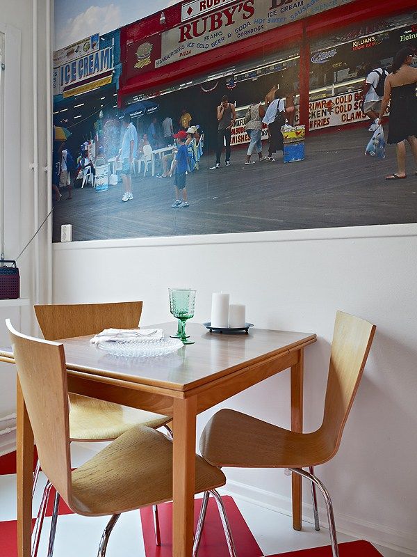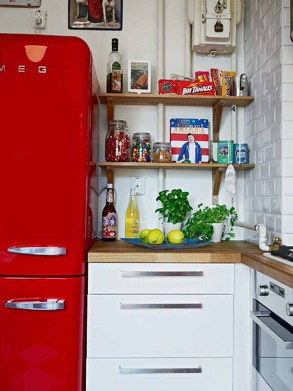 In bucatarie, frigiderul rosu de la Smeg (un brand renumit pentru modelele sale de frigidere retro, colorate) este vedeta. Restul mobilierului alb si faianta tip Subway completeazadecorul de inspiratie retro, dar contemporan in acelasi timp. Spatiul nu este foarte generos, dar suficient pentru a integra si un loc de luat masa.