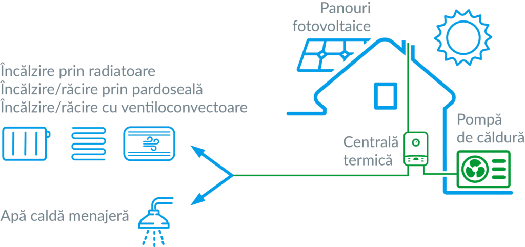 Pompa de căldură poate funcționa atât iarna, cât și vara pentru răcirea locuinței. În funcție de sezon, aceasta inversează procesul, însă are nevoie de ventiloconvectoare sau de răcire prin pardoseală pentru a îndeplini funcția de răcire. În plus, pentru a reduce semnificativ consumul de energie electrică, pompa de caldură funcționează perfect și cu panourile fotovoltaice care îi oferă energia solară necesară, ceea ce va face locuința ta și mai prietenoasă cu natura.
