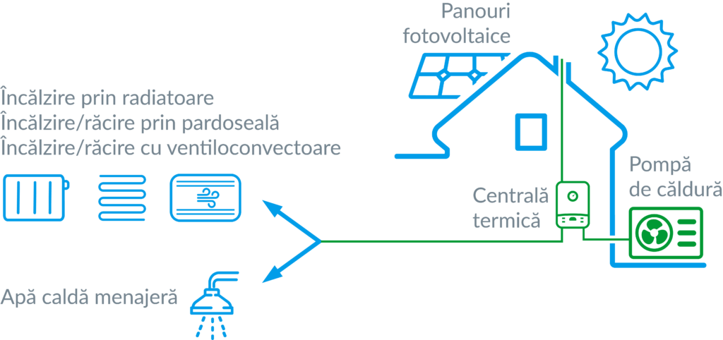Pompa de căldură poate funcționa atât iarna, cât și vara pentru răcirea locuinței. În funcție de sezon, aceasta inversează procesul, însă are nevoie de ventiloconvectoare sau de răcire prin pardoseală pentru a îndeplini funcția de răcire. În plus, pentru a reduce semnificativ consumul de energie electrică, pompa de caldură funcționează perfect și cu panourile fotovoltaice care îi oferă energia solară necesară, ceea ce va face locuința ta și mai prietenoasă cu natura.