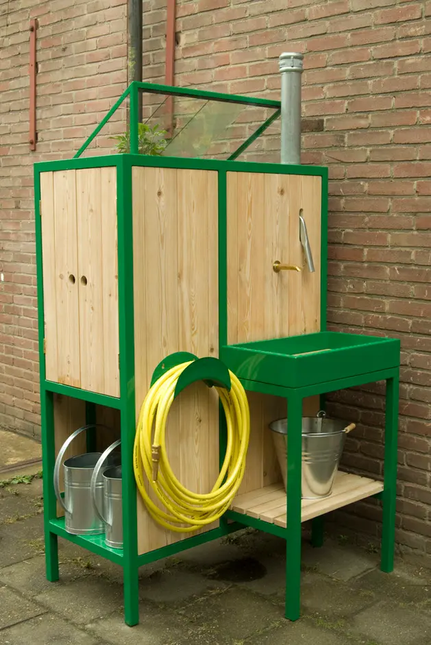 Spatiile interioare pot tine diverse unelte, insa cel mai important al acestui spatiu multifunctional este rezervorul de apa. Astfel, te poti spala pe maini oricand si poti uda gradina din abundenta, cu ajutorul furtunului atasat.