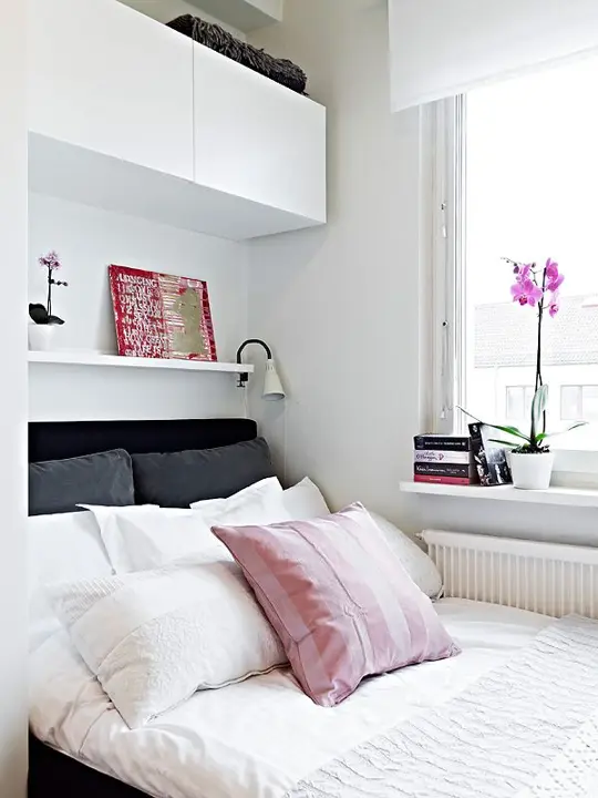 Apoi, ganditi-va cum puteti salva spatiu de la suprafata pardoselii. Renuntati la ideea de comoda clasica. Alegeti variante suspendate, eventual integrate in tablia patului. In acelasi context, se poate opta si pentru etajere sau rafturi suspendate. Nu foarte multe, pentru a nu incarca inutil peretii. Acestea pot fi asezate deasupra patului sau pe un perete lateral. Retineti ca pentru orice spatiu mic, amenajarea pe verticala este o solutie veritabila care merita explorata.