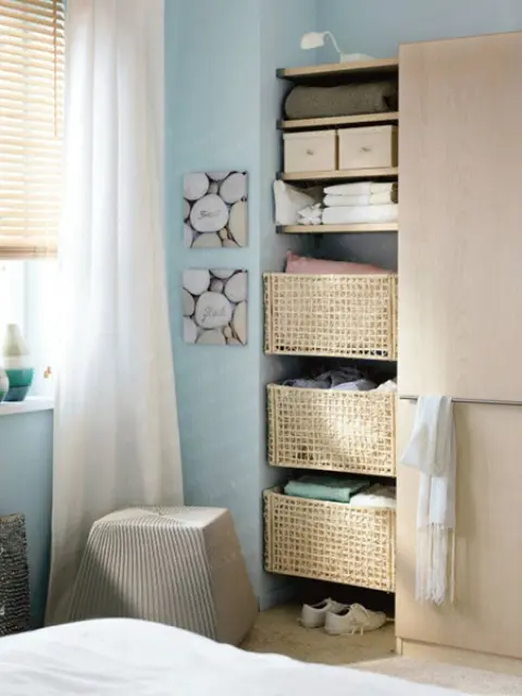 Mobilierul multifunctional este cheia rezolvarii problemelor. Incepeti cu patul. Alegeti un model cu sertare spatioase care sa va permita sa asezati lucrurile voluminoase precum pilotele sau pernele, sau macar cu spatiu liber dedesubt pentru a putea introduce ulterior cutiile cu cele depozitate in ele sau cosuri spatioase din ratan sau rachita. Pot fi acoperite cu o lenjerie de pat mai lunga pentru a masca aspectul inestetic.